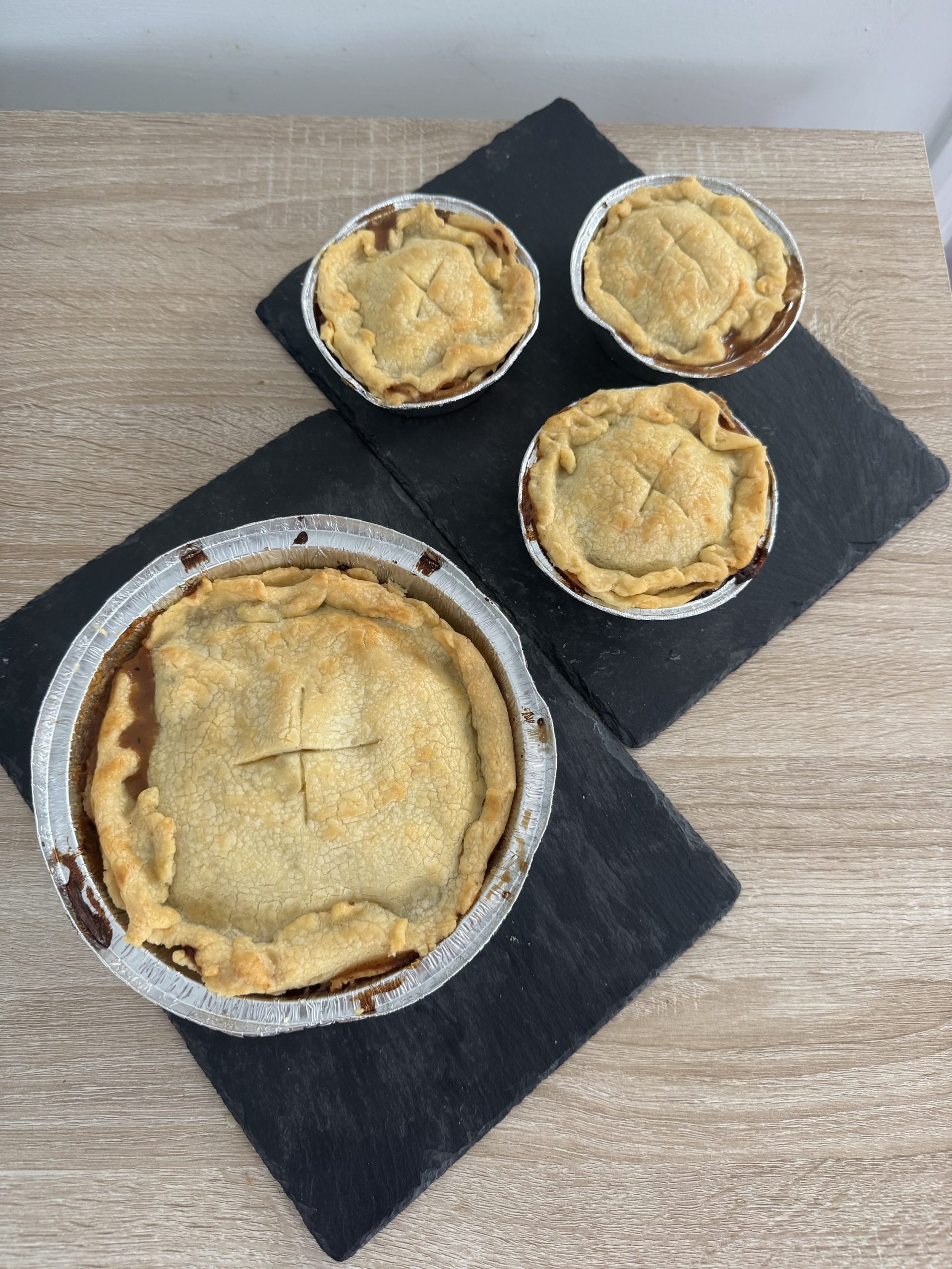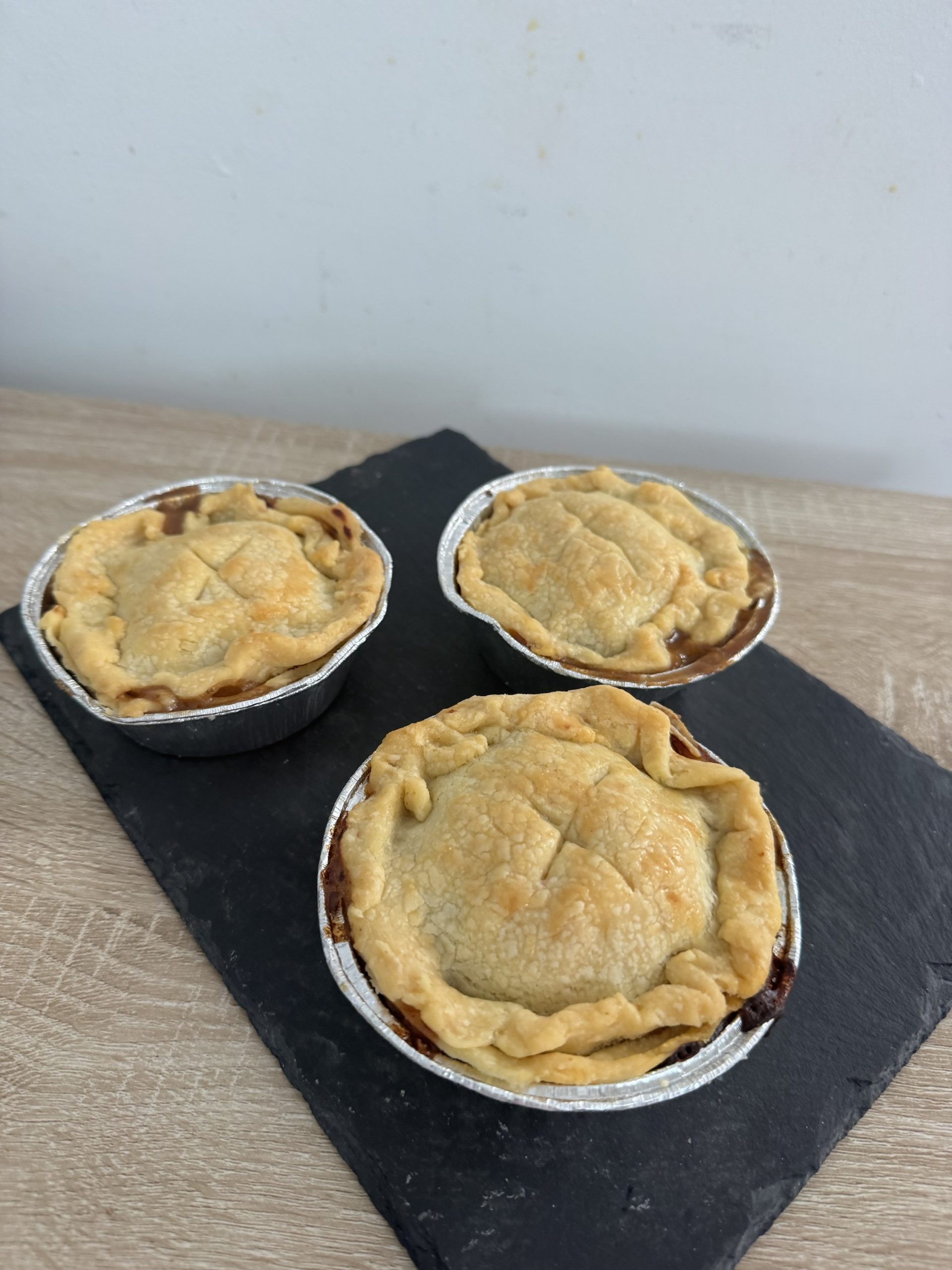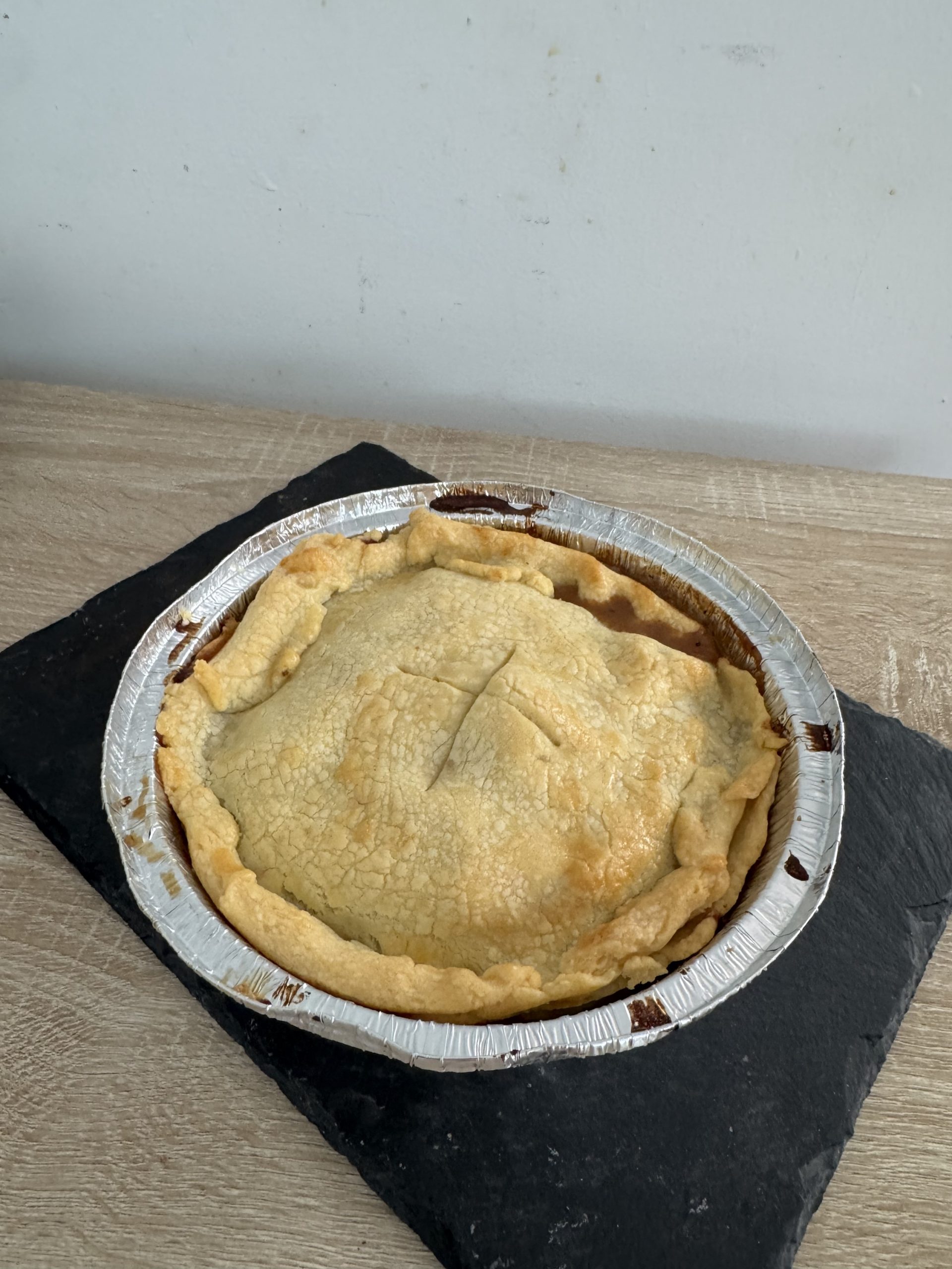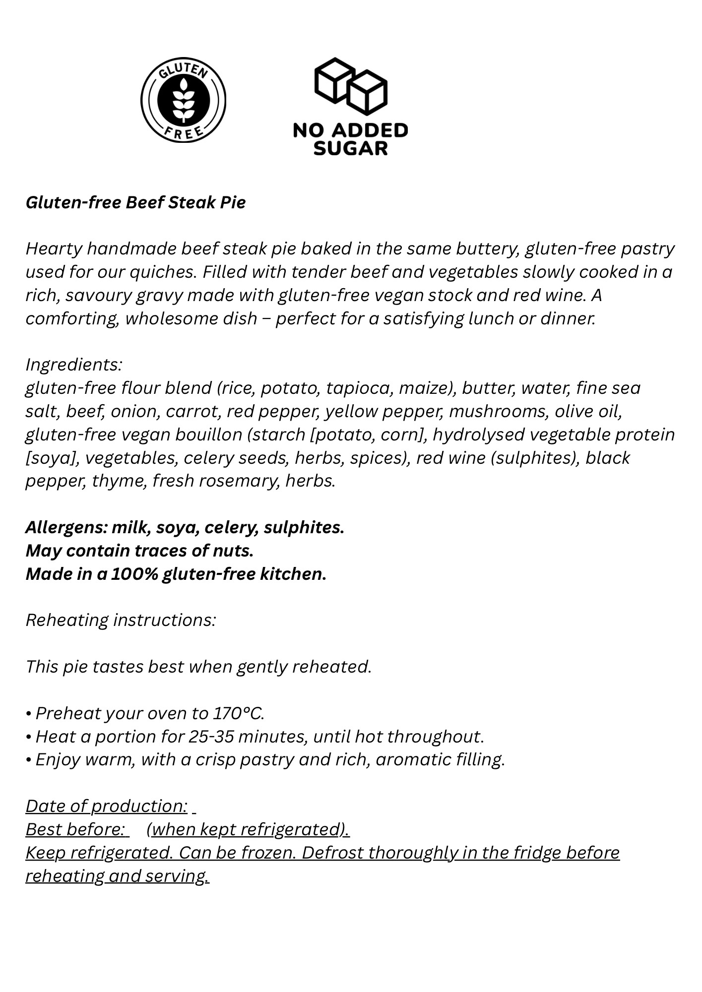 Hearty handmade beef steak pie, baked in the same buttery gluten-free pastry used for our quiches. Filled with tender beef and vegetables, slowly cooked in a rich, savoury gravy made with gluten-free vegan stock and red wine. A comforting, wholesome dish, perfect for a satisfying lunch or dinner.