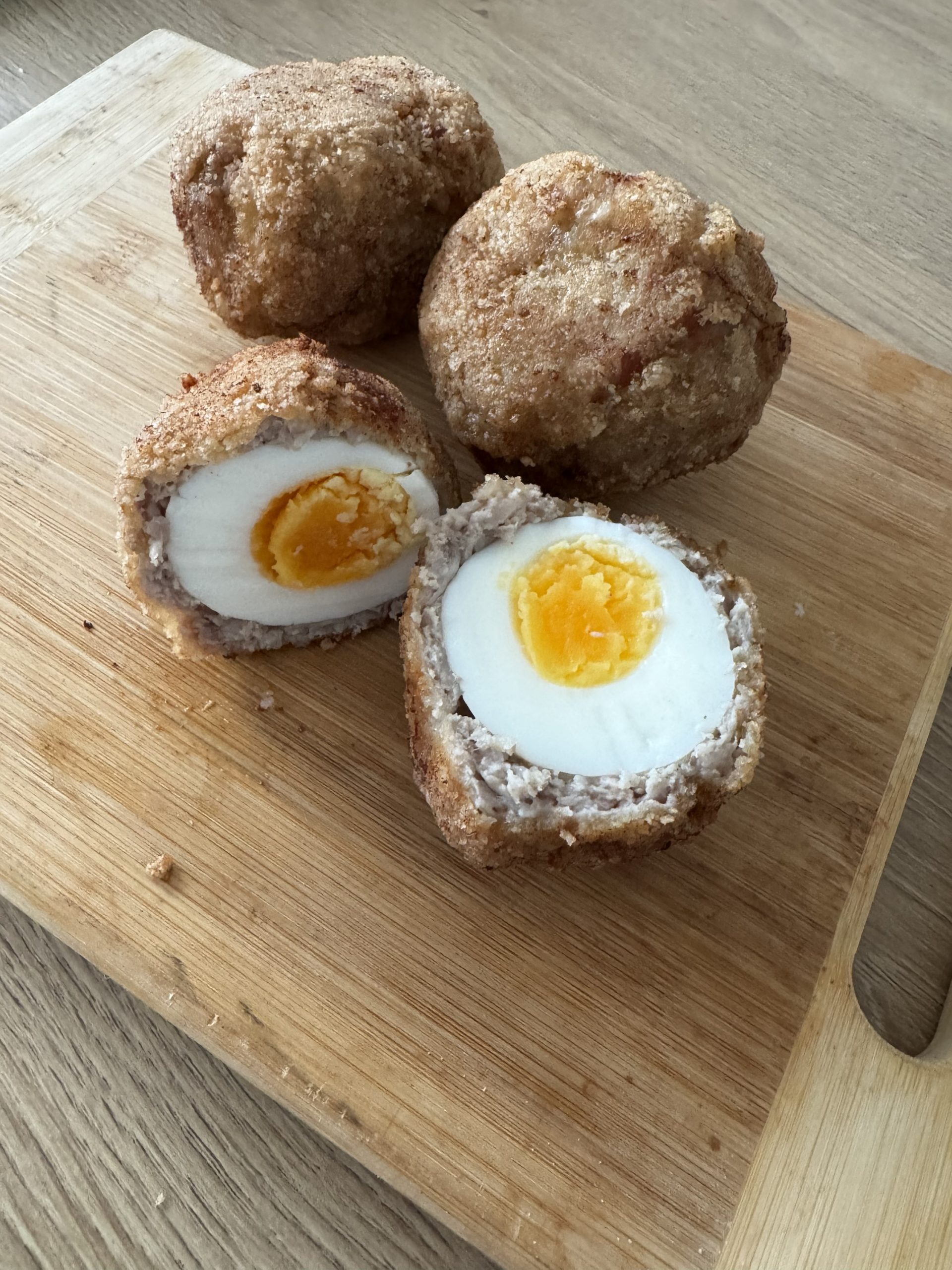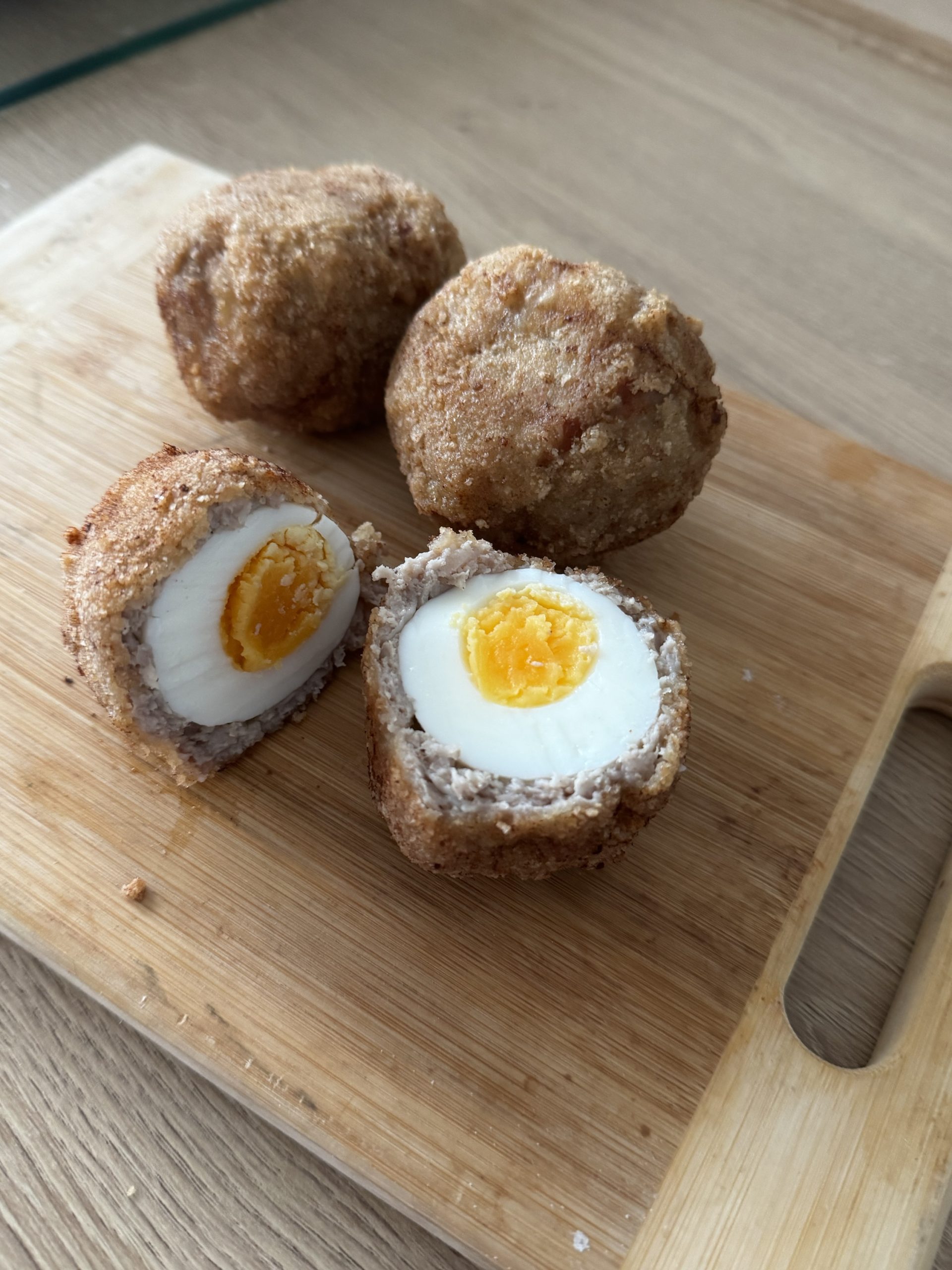 If reheating, preheat your oven to 160ºC and warm the Scotch eggs for 10–12 minutes, until heated through.