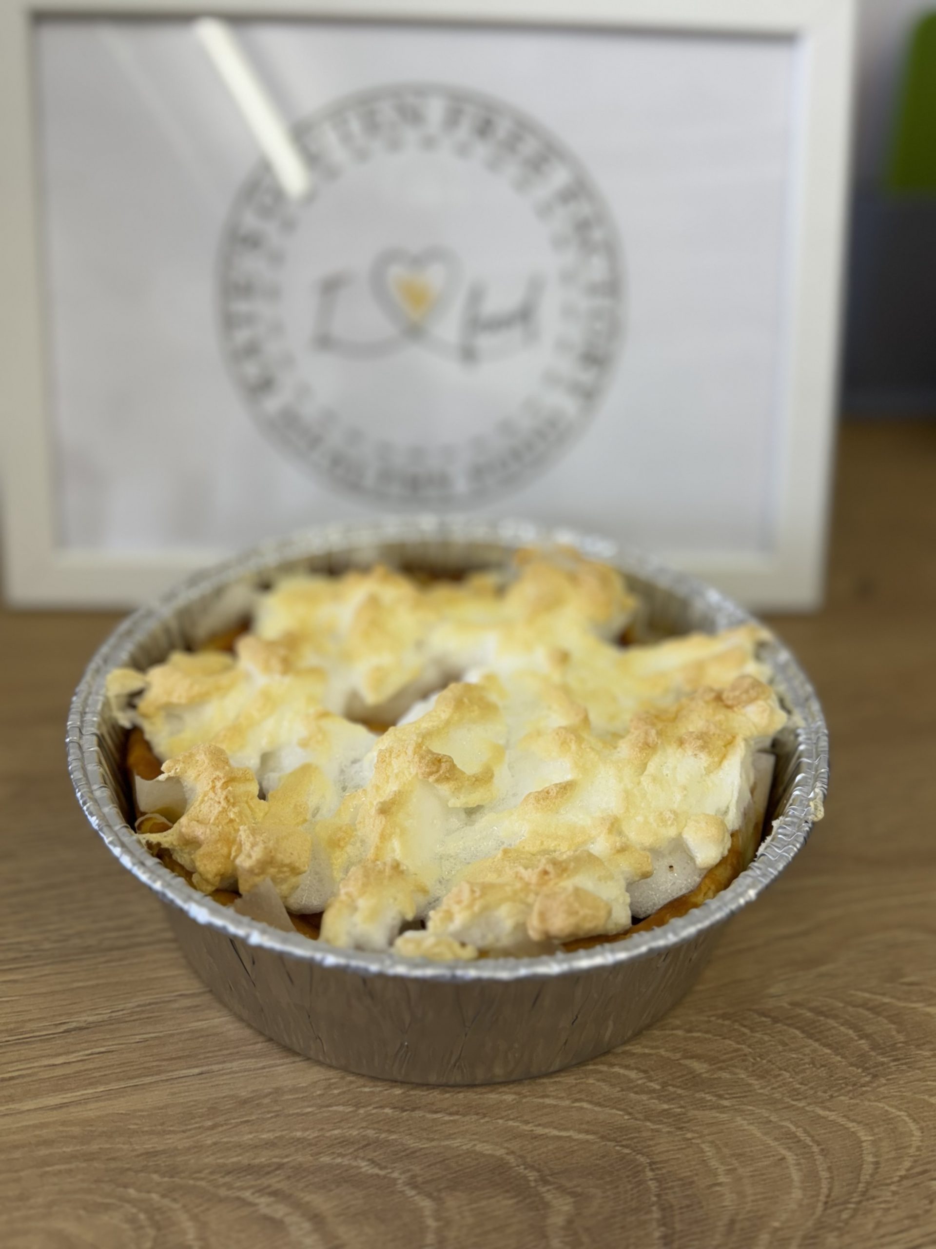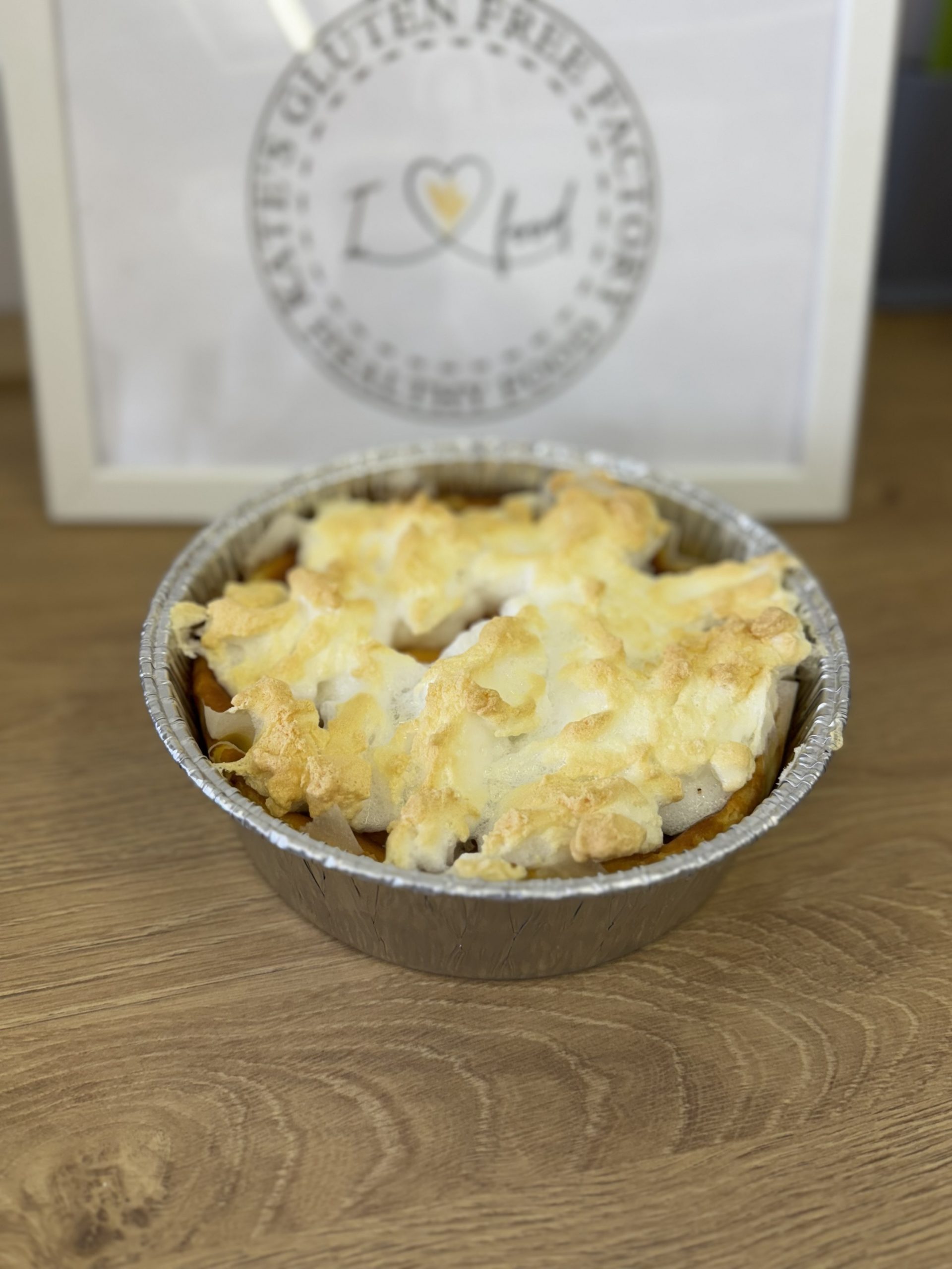 Baked in an aluminium foil tin, size 8” (approx. 20 cm diameter, 6 cm deep).