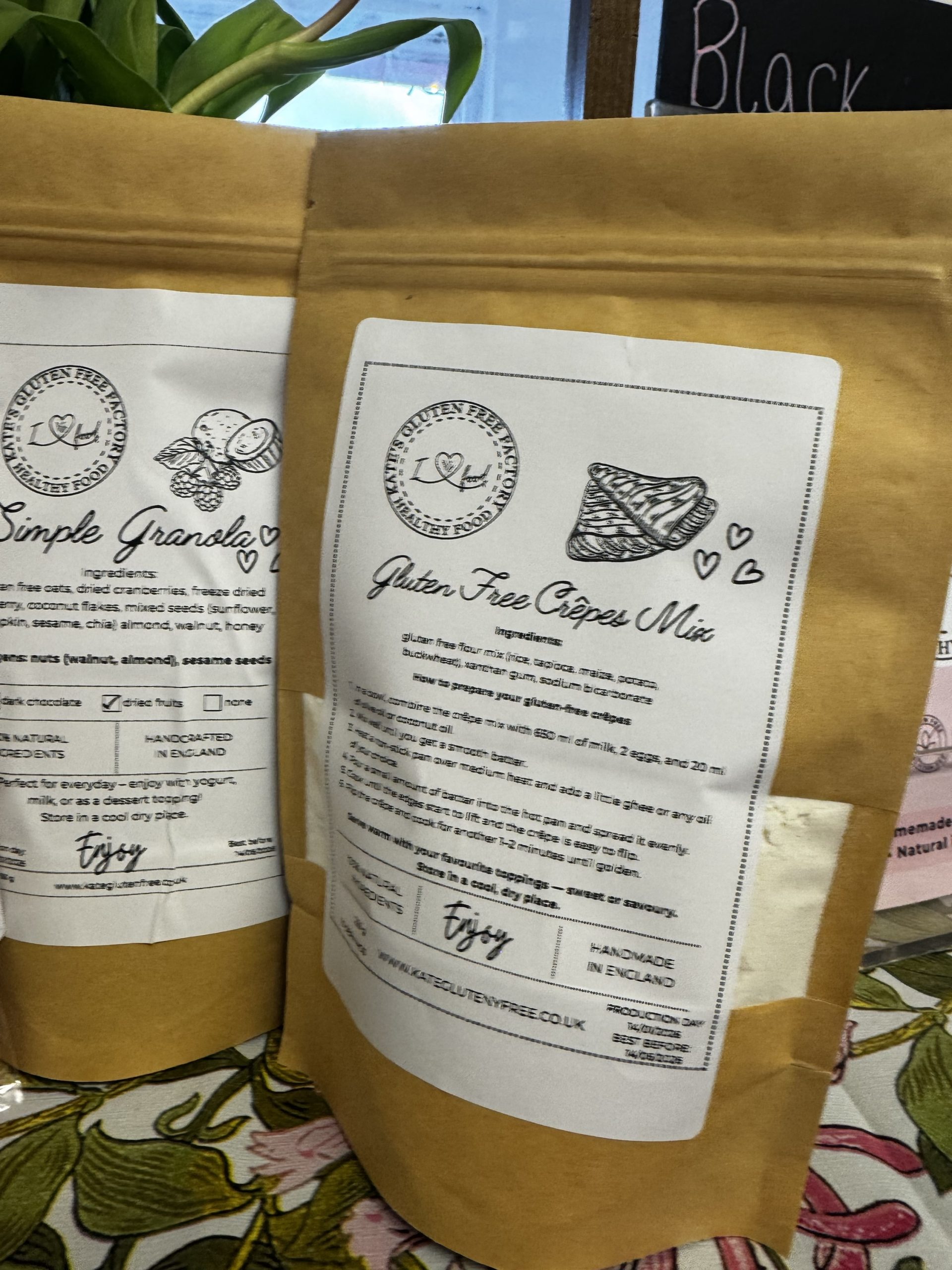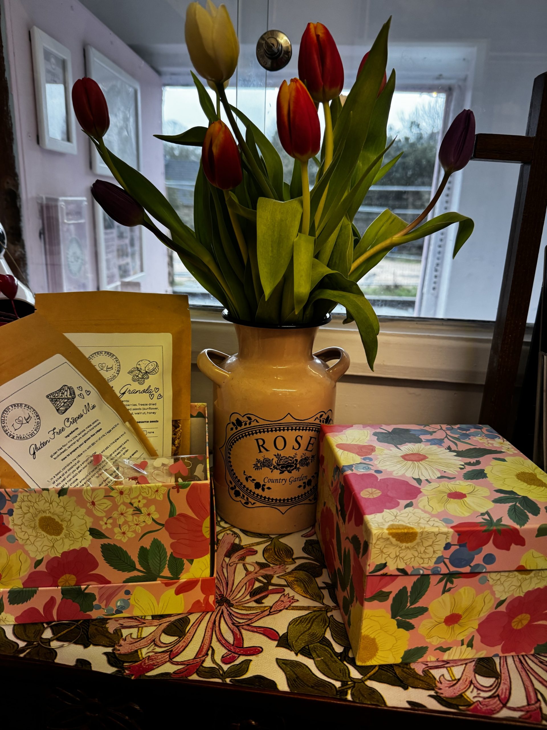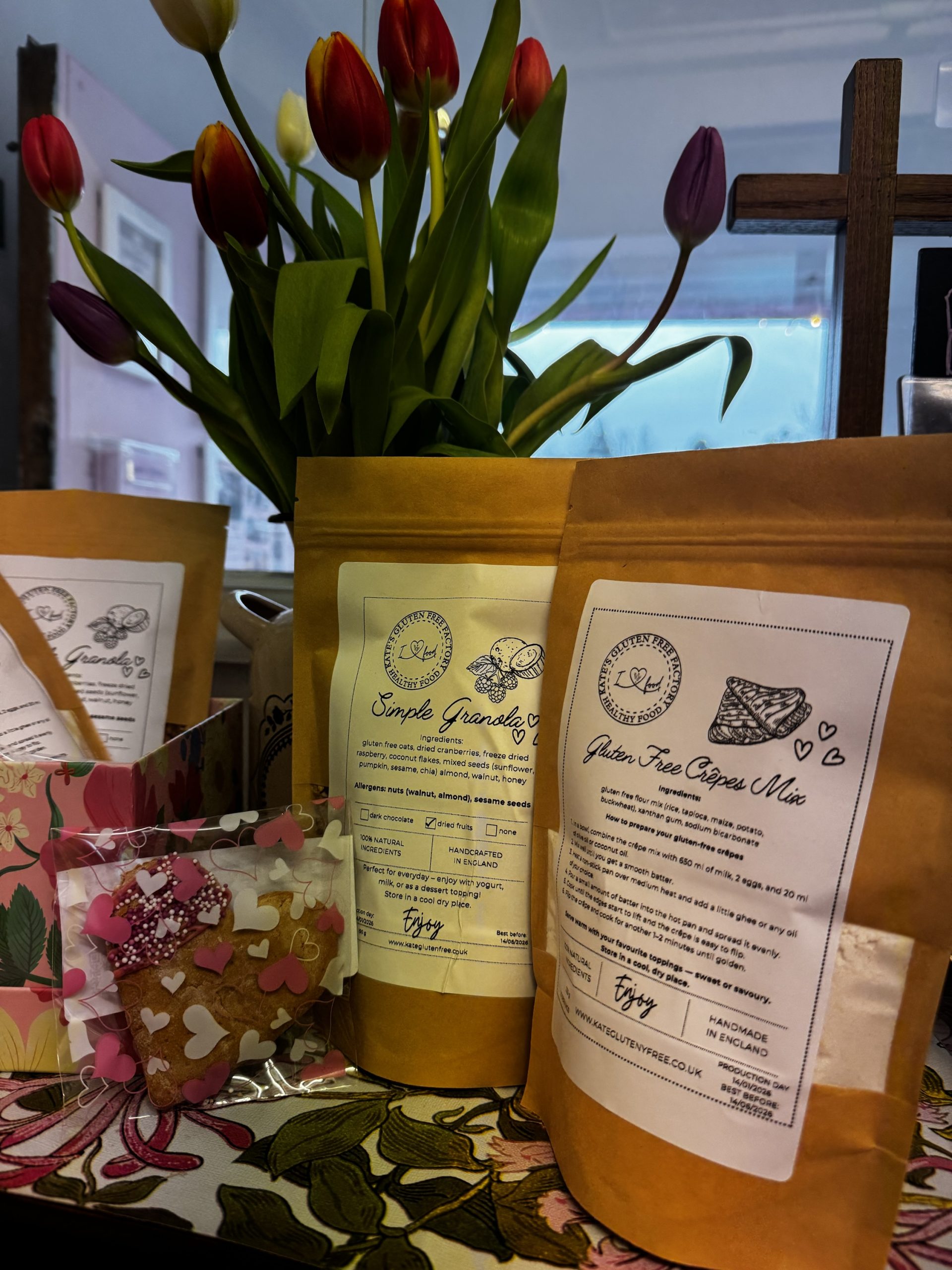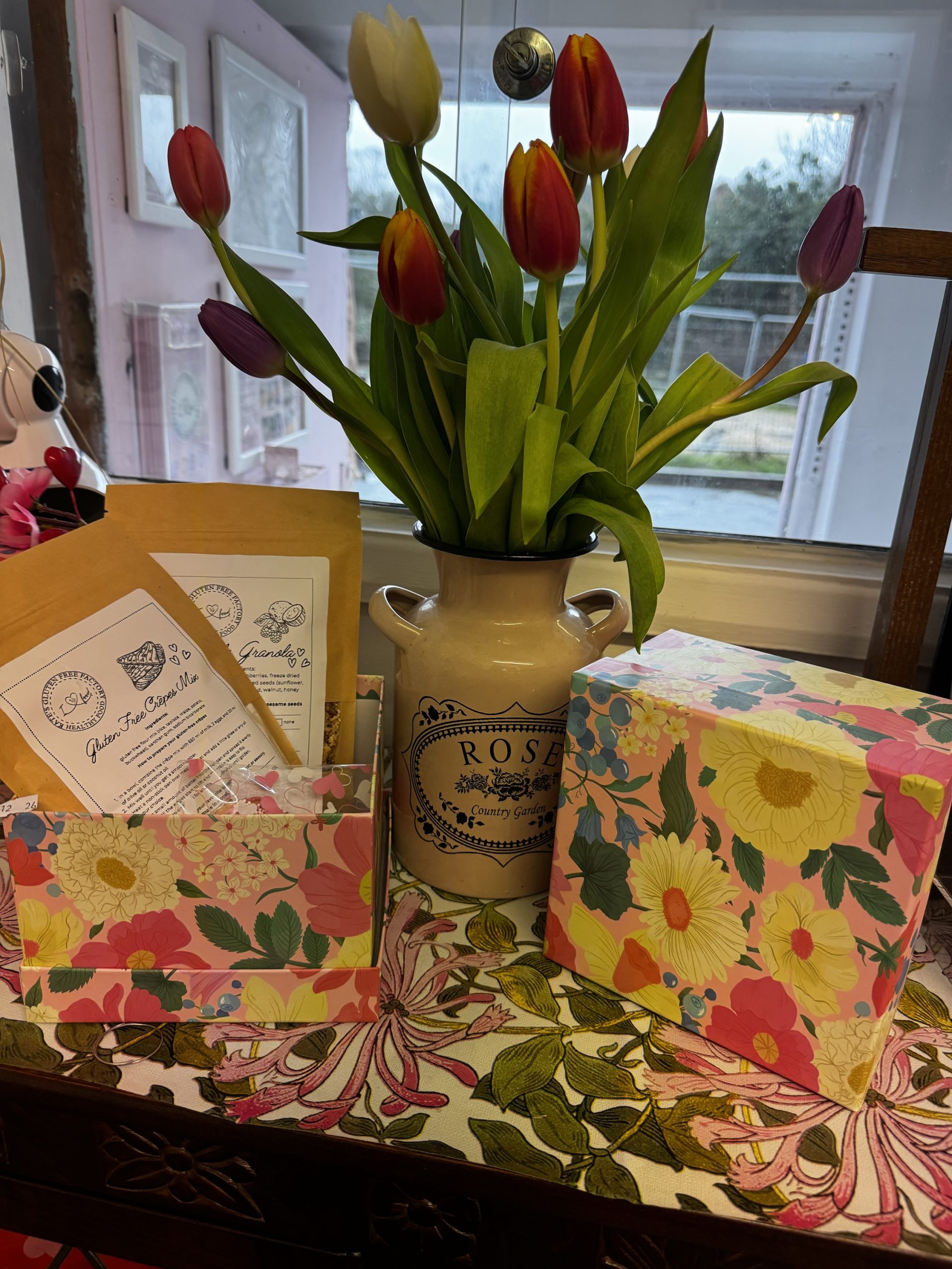 Tags/keywords: Mother’s Day gift box, gluten free gift, handmade treats, crêpes mix, granola, gingerbread heart, floral gift box, British handmade, Mother’s Day food gift
