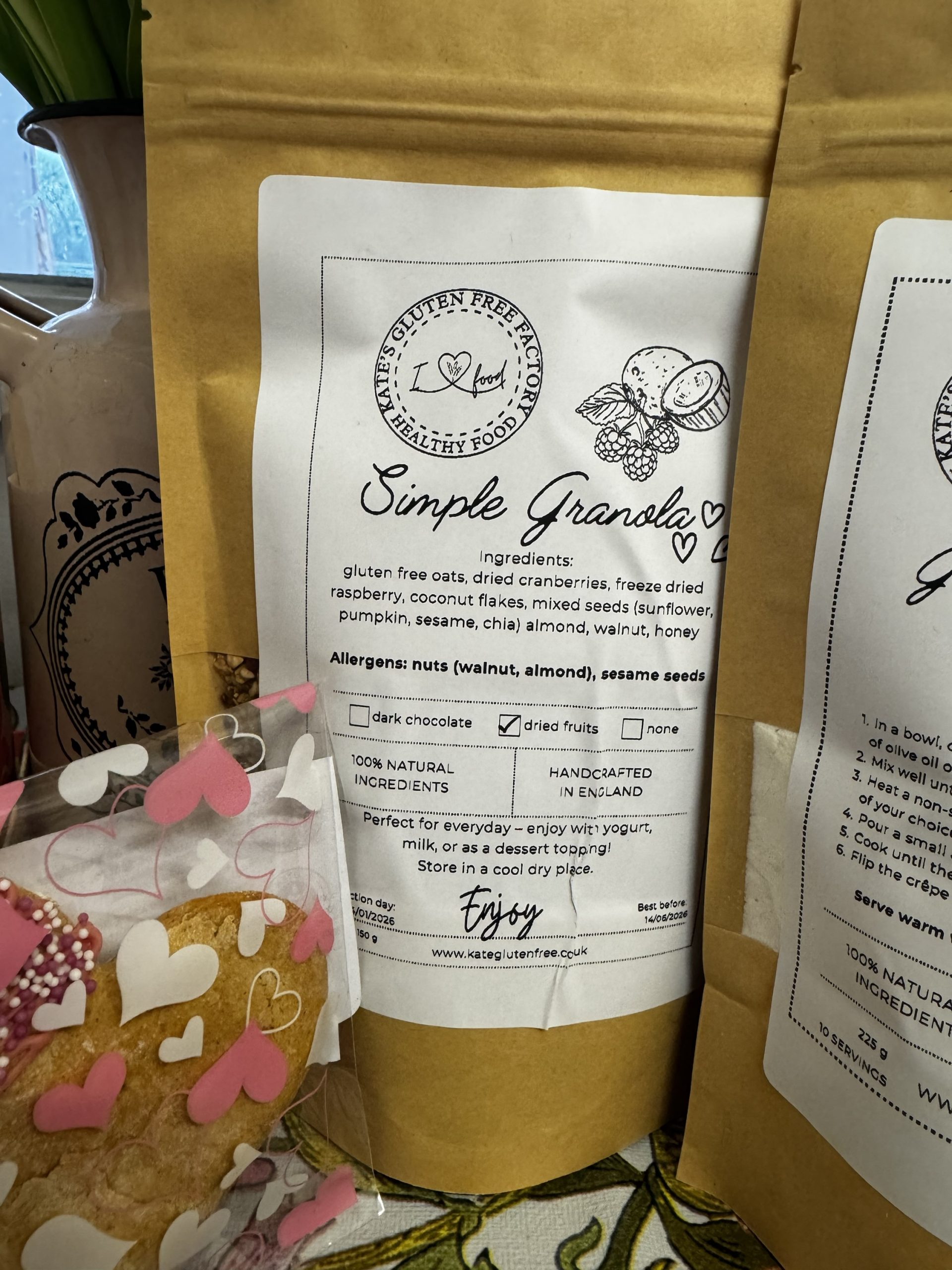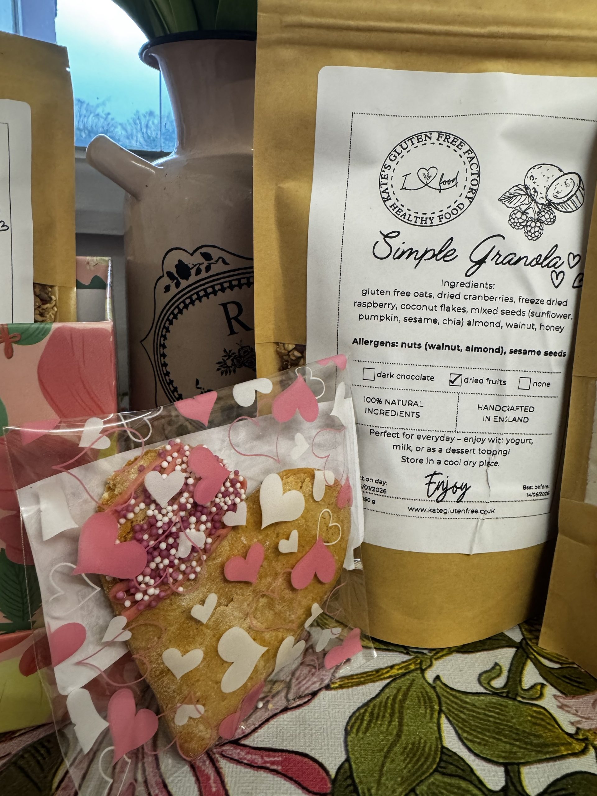 A limited-edition Mother’s Day gift box filled with three handcrafted favourites: Simple Granola (Special Edition), Gluten-Free Crêpes Mix (for the perfect cosy breakfast), and a Gluten-Free Gingerbread Heart decorated with coloured white chocolate and sprinkles.