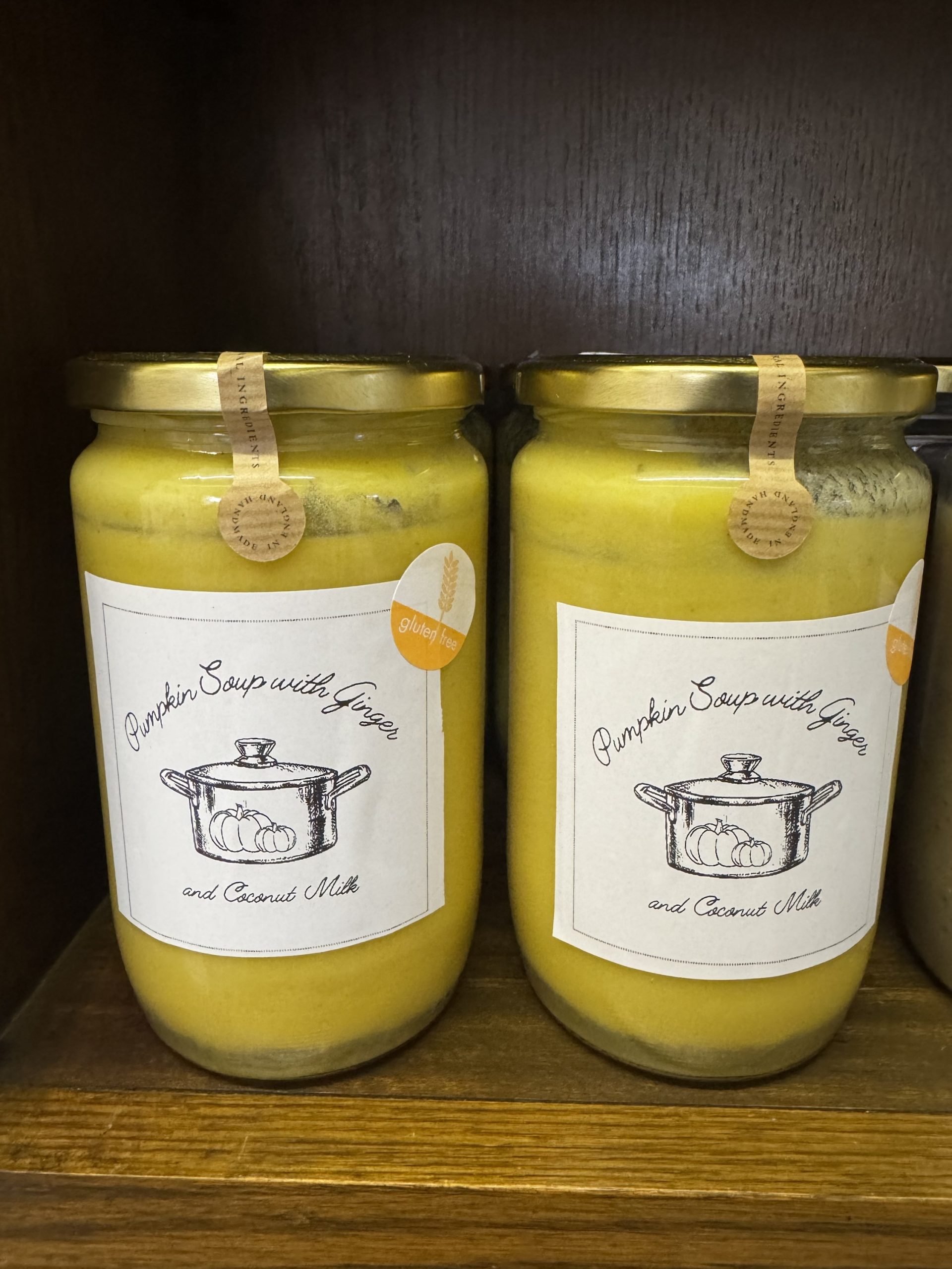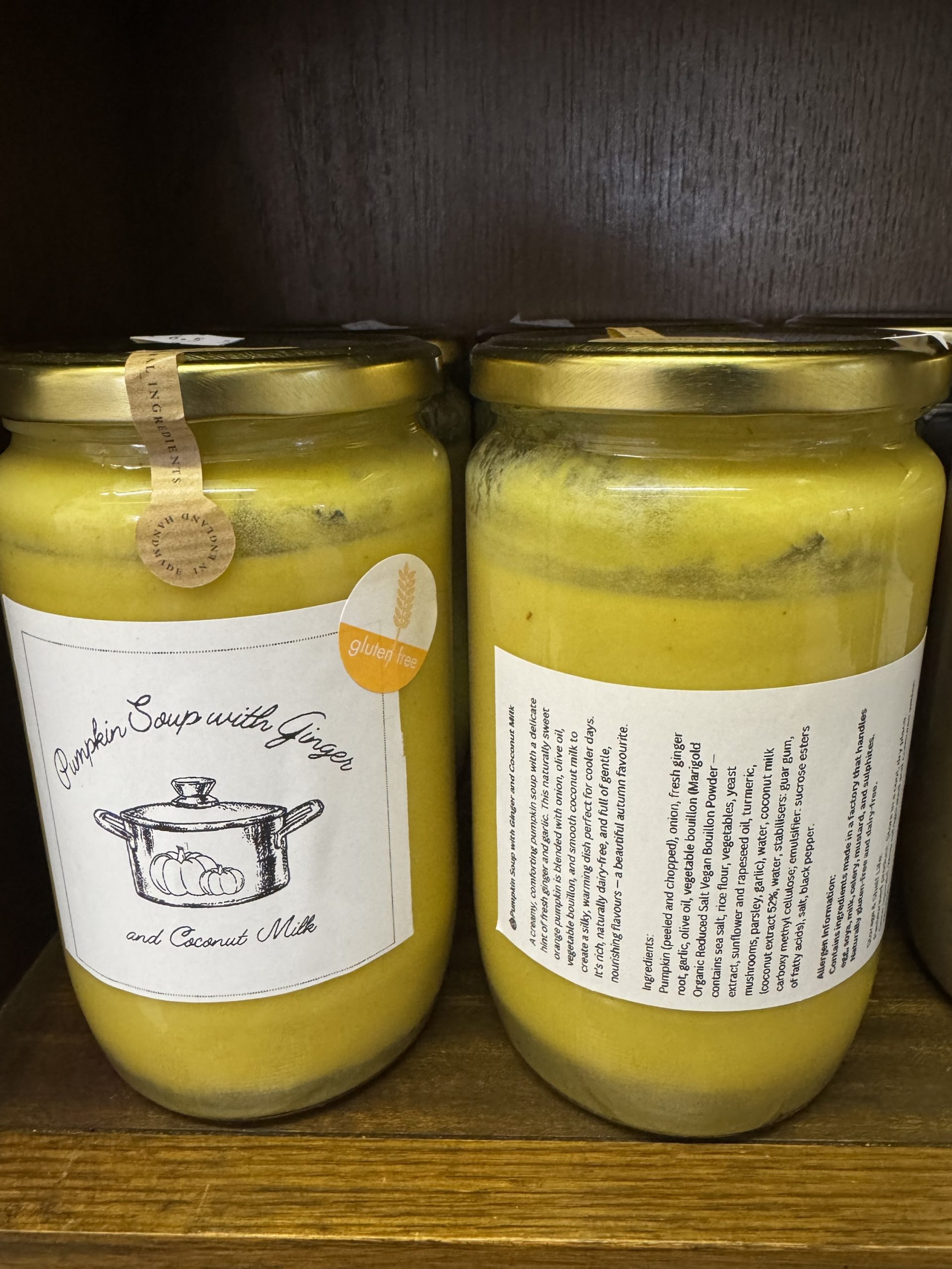 Pumpkin (peeled and chopped), onion, fresh ginger root, garlic, olive oil, vegetable bouillon (Marigold Organic Reduced Salt Vegan Bouillon Powder — contains sea salt, rice flour, vegetables, yeast extract, sunflower and rapeseed oil, turmeric, mushrooms, parsley, garlic), water, coconut milk (coconut extract 52%, water, stabilisers: guar gum, carboxy methyl cellulose; emulsifier: sucrose esters of fatty acids), salt, black pepper.